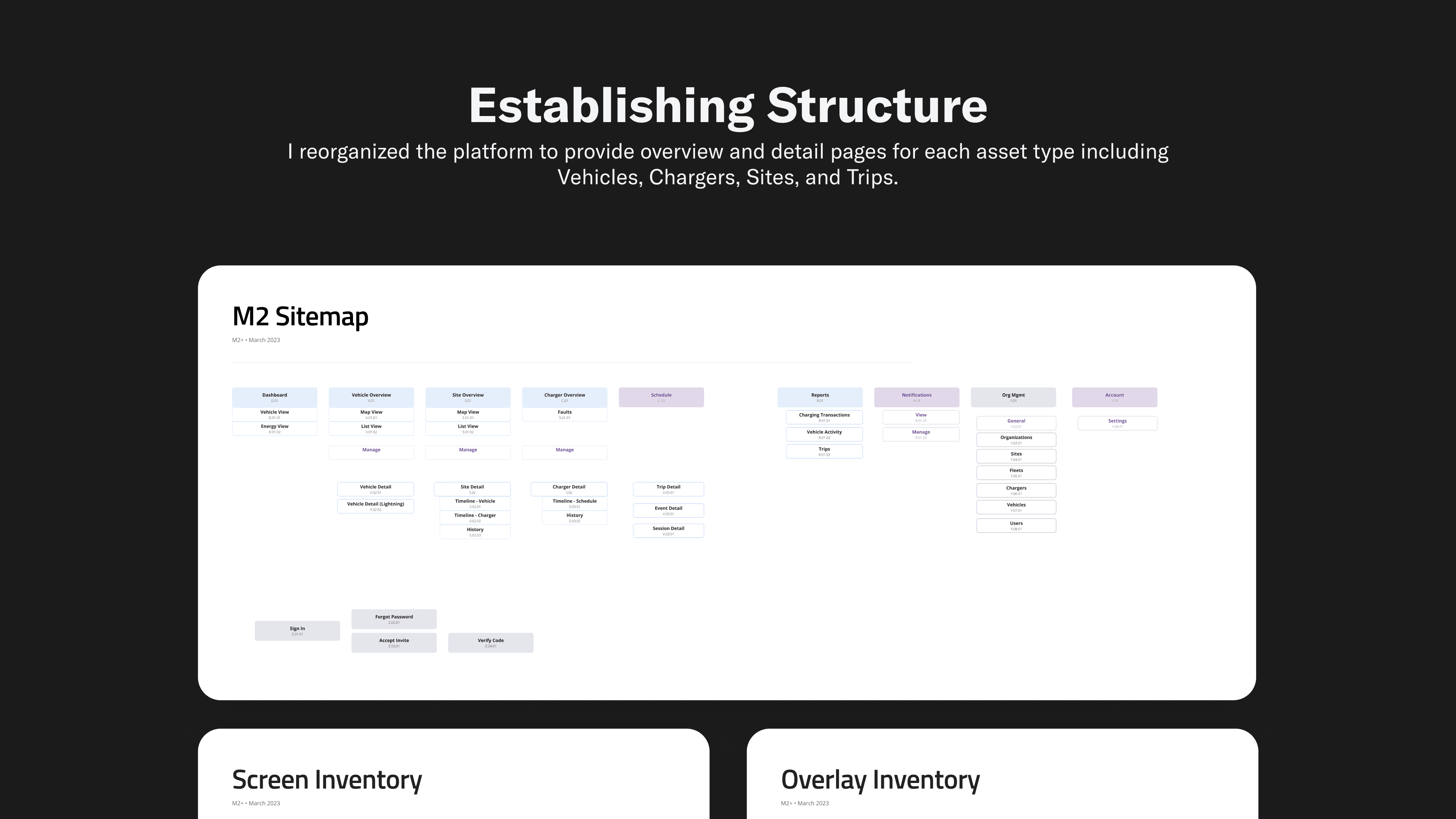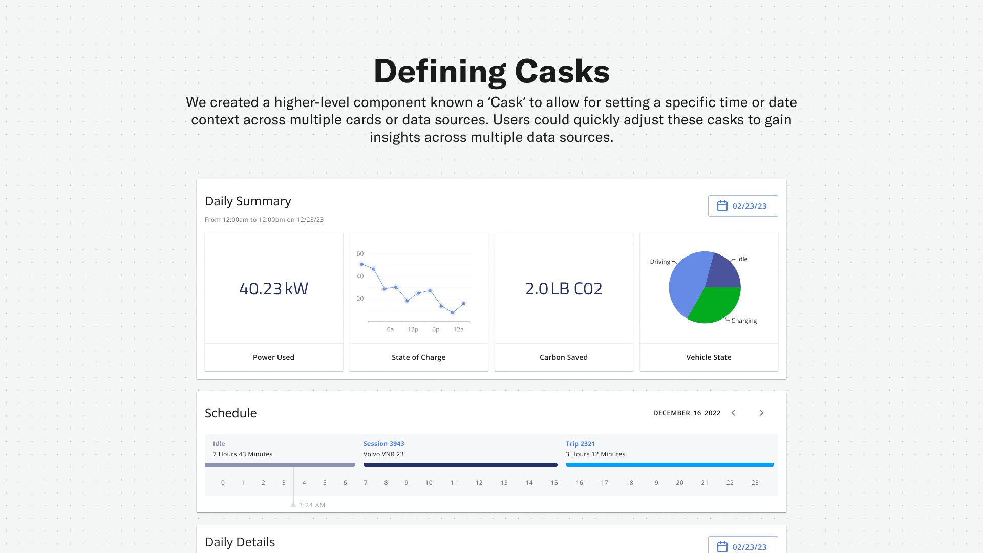 The core design challenge centered on making highly technical fleet operations data immediately comprehensible to users with varying levels of technical expertise. I established a component library focused on charting and table patterns specifically tailored for electric vehicle charge management visualization, including real-time state of charge monitoring, time-of-use optimization displays, demand response alerts, and multi-site energy distribution views. The interface needed to surface critical operational data (charging status, battery health, energy consumption patterns) while enabling proactive decision-making around load management and grid participation. Working across the platform migration and redesign, I developed visualization standards that could communicate complex scenarios like cold-weather battery preconditioning schedules, automated charging session sequencing to maintain vehicle connectivity, and bidirectional energy flow during V2G events. The design system balanced density of information with clarity of action, allowing fleet managers to monitor hundreds of vehicles across multiple depots while drilling into individual asset performance when anomalies required attention.