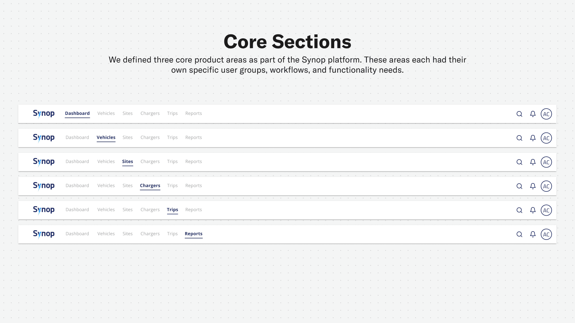 As Design Director for Synop, I faced the challenge of defining the complete product and brand experience for an electric vehicle fleet management platform entering a rapidly evolving market. Commercial fleet operators were navigating the complexity of EV adoption without integrated tools to manage charging infrastructure, energy costs, vehicle performance, and grid interoperability simultaneously. I orchestrated all design activities across the organization, working closely with engineering, product, and executive teams to establish the foundational design principles and interaction patterns that would enable fleet operators to transition from combustion to electric with confidence. The strategic imperative was clear: create a platform that could scale with fleet operators as their needs evolved from basic charge management to sophisticated energy optimization and vehicle-to-grid (V2G) revenue generation.